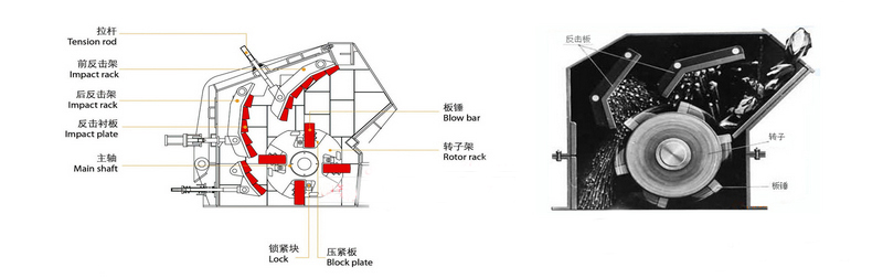 反擊式破碎機是一種利用沖擊能來破碎物料的破碎機械。機器工作時,在電動機的帶動下,轉子高速旋轉,物料進入板錘作用區(qū)時,與轉子上的板錘撞擊破碎,后又被拋向反擊裝置上再次破碎,然后又從反擊襯板上彈回到板錘作用區(qū)重新破碎,此過程重復進行,物料由大到小進入一、二、三反擊腔重復進行破碎,直到物料被破碎至所需粒度,由出料口排出。調整反擊架與轉子之間的間隙可達到改變物料出料粒度和物料形狀的目的。